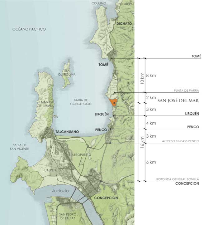 Ubicado en el kilómetro 16 de la Ruta 150, San José del Mar está a sólo 18 minutos del centro de Concepción, a 10 minutos del aeropuerto y mall Plaza del Trébol, a 12 minutos de Talcahuano y a sólo 38 minutos de Chillán.